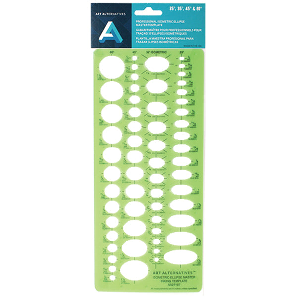 The Art Alternatives Ellipse Template is a flexible, 0.03" thin green plastic drafting template with a matte finish on one side to reduce glare. This template includes 60 ellipses from ¼" to 2 ¾" in projections of 25° , 35° , 45° , and 60° . It includes fractional and decimal inch markings plus metric equivalents, centering lines for precision placement and built-in ink risers for smear-free drawing in pen or pencil. The allowance on all openings is designed for use with 0.5 mm pencil lead or pen point.