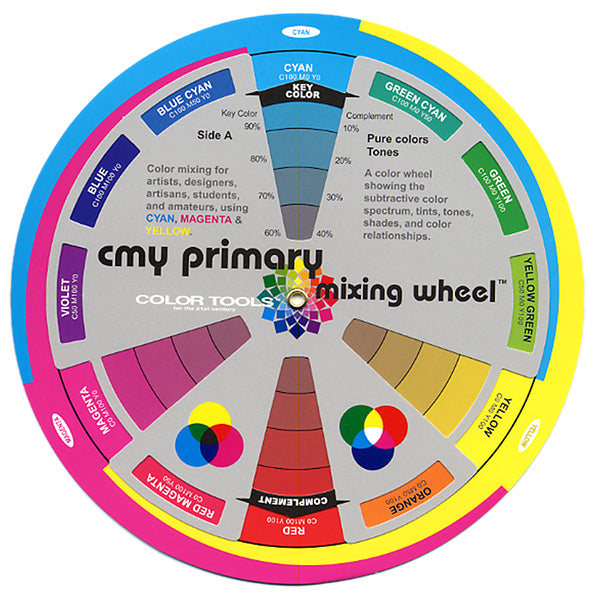 A great visual tool for artists, designers, students, and any creative person who uses Cyan, Magenta, and Yellow as their primary mixing colours. The CMY mixing wheel outlines the subtractive colour spectrum, tints, tones, shades, and colour relationships. It also includes a CMY Primary Workbook. Using this tool, you can learn how to mix a full spectrum of colours using Cyan, Magenta, and Yellow, plus White and Black. 7.75″ diameter.