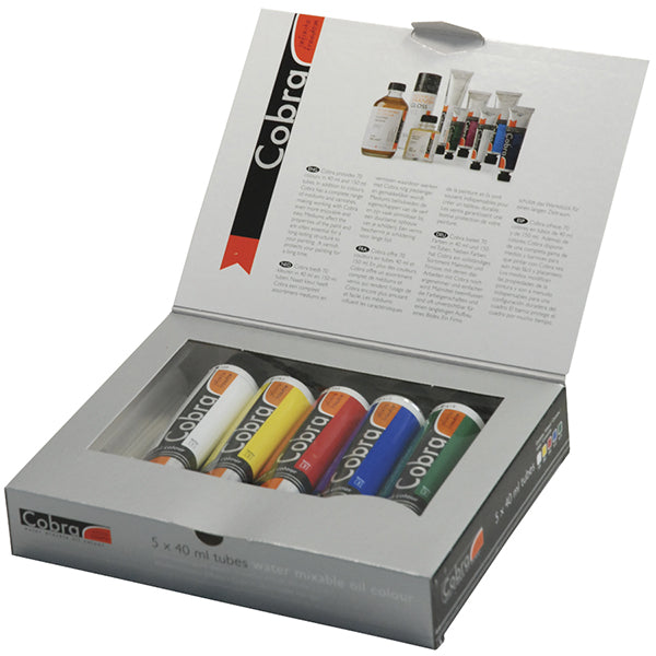 Set contains five 40 ml tubes includes Permanent Yellow Light, Pyrrole Red Deep, Cobalt Blue Ultramarine, Permanent Green Deep, and Titanium White. Clean up with water and soap – no need for white spirits! Cobra oils look the same as traditional oils when dry and have a high degree of lightfastness.