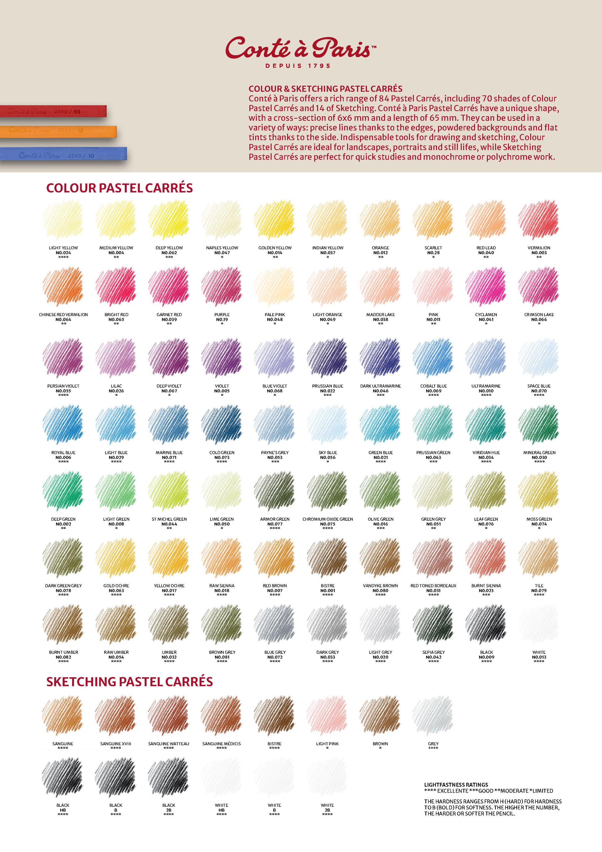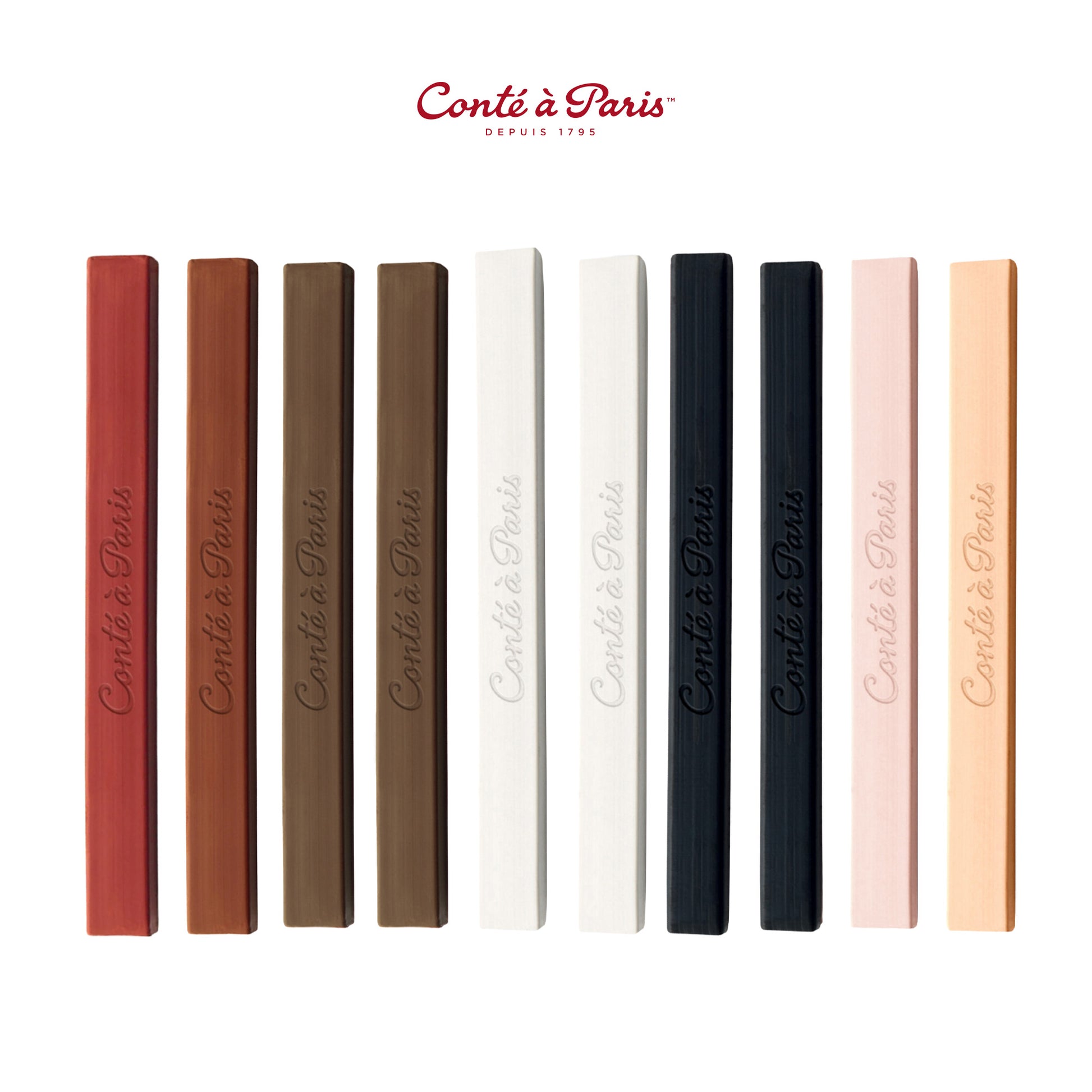 Of the 84 shades available in the Conté à Paris range, 14 are crafted specifically for sketching. These Sketching Carrés are a traditional tool of artistic expression and remain the benchmark for pastels, chosen by artists for their versatility and slightly softer texture than pencils. Among the most iconic colours are Bistre, which enriches the Sanguine palette with a burnished brown; Sanguine itself, made with natural pigments for vibrant, monochrome red drawings; and Pierre Noire, a velvety, deep black available in HB, B, and 2B grades for everything from crisp precision to bold, expressive shading.