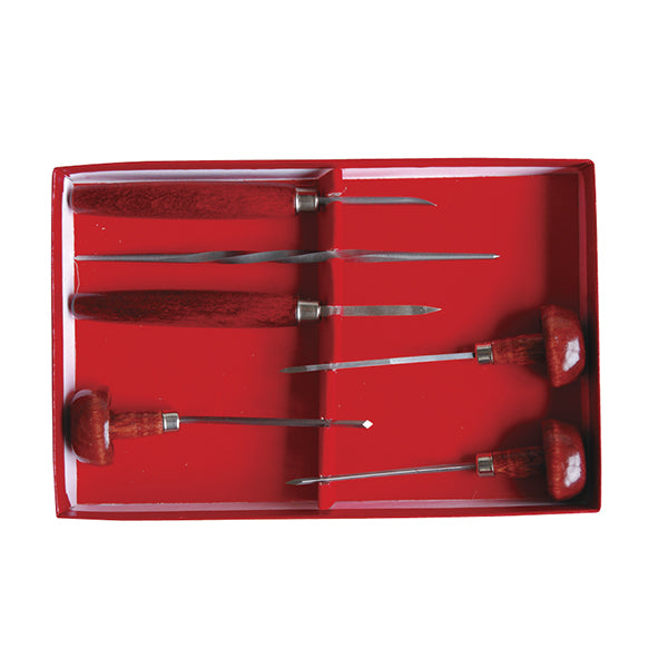 The Edward C Lyons Intaglio Etching Set of 6 contains the basic etching tools needed to start working with metal plates: copper, zinc, steel and magnesium. They are also good for working on plastic plates. Create lines, tones and textures. These high quality tools include 3 burins of different shapes, a twisted double-point tool, a solid blade scraper and a curved burnisher.
