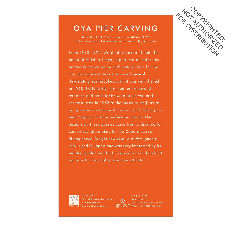 The Frank Lloyd Wright Imperial Hotel Multi Puzzle Set includes three 250 Piece coordinating puzzles of Wright's iconic art. Galison puzzles are packaged in matte-finish sturdy boxes, perfect for gifting, reuse, and storage. Three color inserts of each full puzzle image are also included.