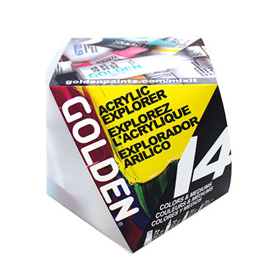This Acrylic Explorer Starter Set of 14 contains samples of GOLDEN's Heavy Body Acrylics, OPEN Acrylics, Fluid Acrylics, and High Flow Acrylics, as well as an assortment of acrylic gels and mediums, ideal for trying out a wide assortment of GOLDEN products at an economical price.