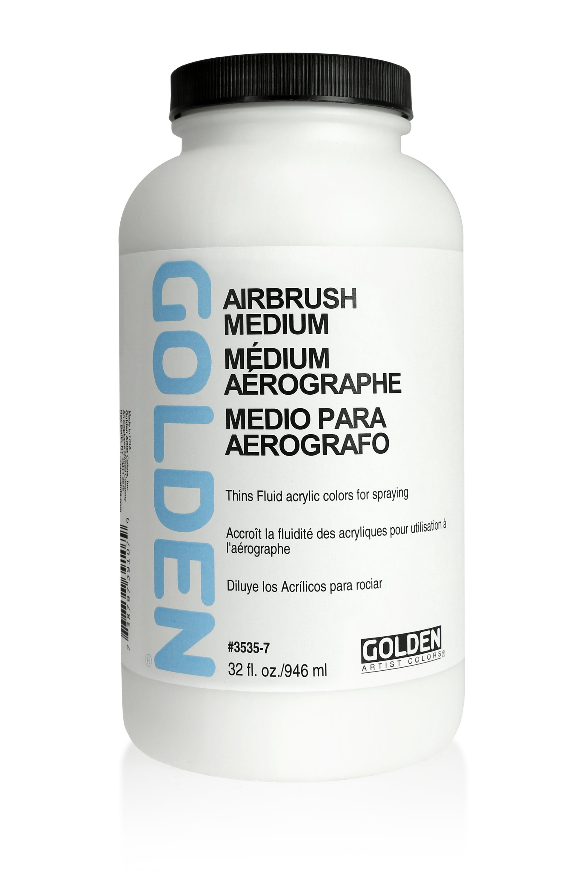 GOLDEN Airbrush Medium is a 100% acrylic binder system designed to modify GOLDEN Fluid Acrylics for spray application. This mixture effectively reduces clogging and tip build up during spraying. This medium may also be used to thin other GOLDEN products such as Iridescent/ Interference colours and gesso for spray applications.