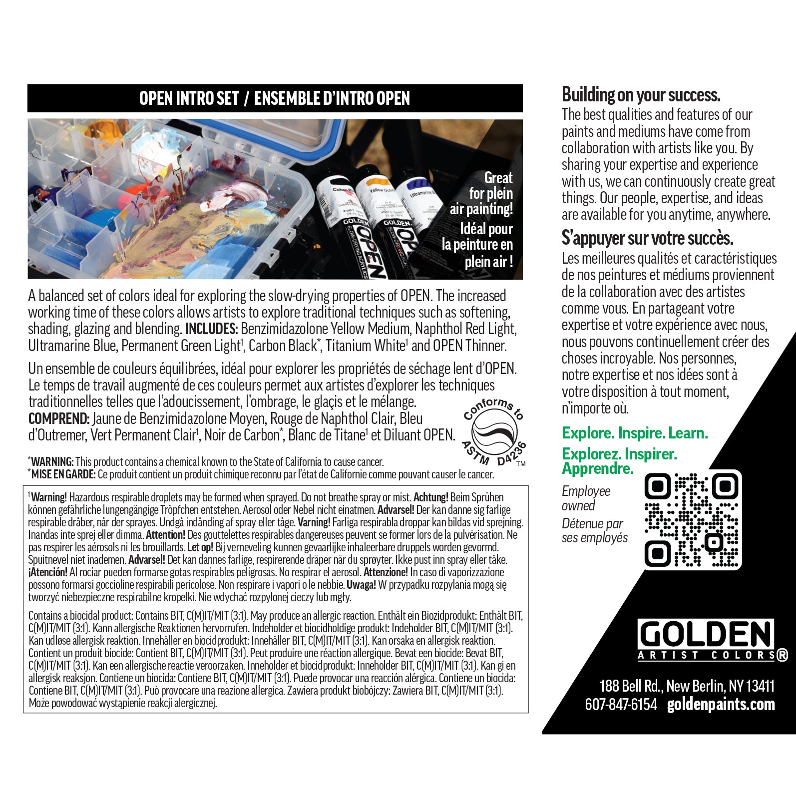 CONTENTS: Six colors in 3/4 fl. oz. / 22ml Tubes (Benzimidazolone Yellow Medium, Naphthol Red Light, Ultramarine Blue, Permanent Green Light, Carbon Black* and Titanium White) and one 1 fl. oz. / 30ml Bottle of OPEN Thinner.