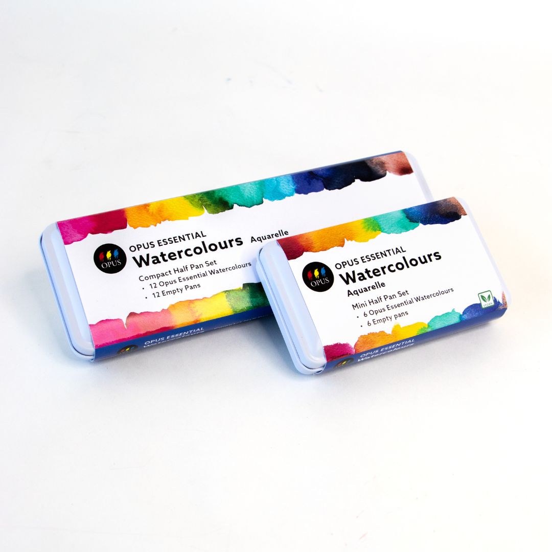 The Opus Essential Watercolours Compact Tin Set contains 12 of our vegan-friendly, Opus Essential Watercolour paints to form a basic palette: