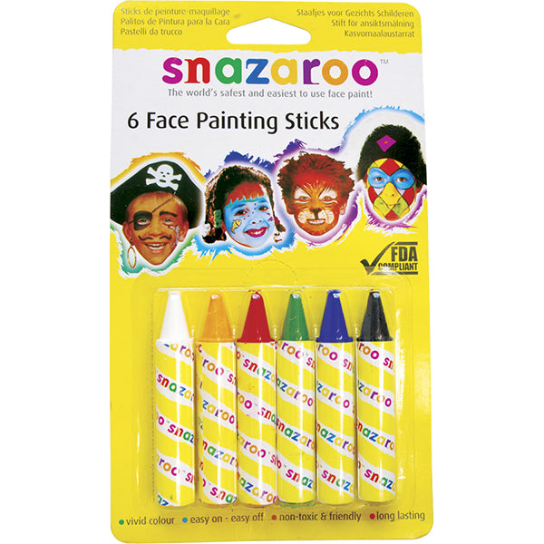 Create great characters, animals, and more with the Snazaroo Face Painting Stick Set. No brushes needed; simply draw using the handy paint sticks. Snazaroo paints are safe, non-toxic, and easy to apply and remove. Used by professional face painters, they give you amazing colour without smearing or fading. This set contains 6 coloured sticks: White, Black, Red, Blue, Green and Yellow.