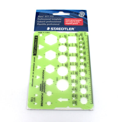 All STAEDTLER templates, unless otherwise specified, are made from dimensionally stable 0.03" green transparent plastic. They have a matte finish on one side to reduce glare, and cut-out identification and ruler scales are printed in easy-to-read black ink. Centering lines are printed around the cutouts, and metric scales are included on many templates.