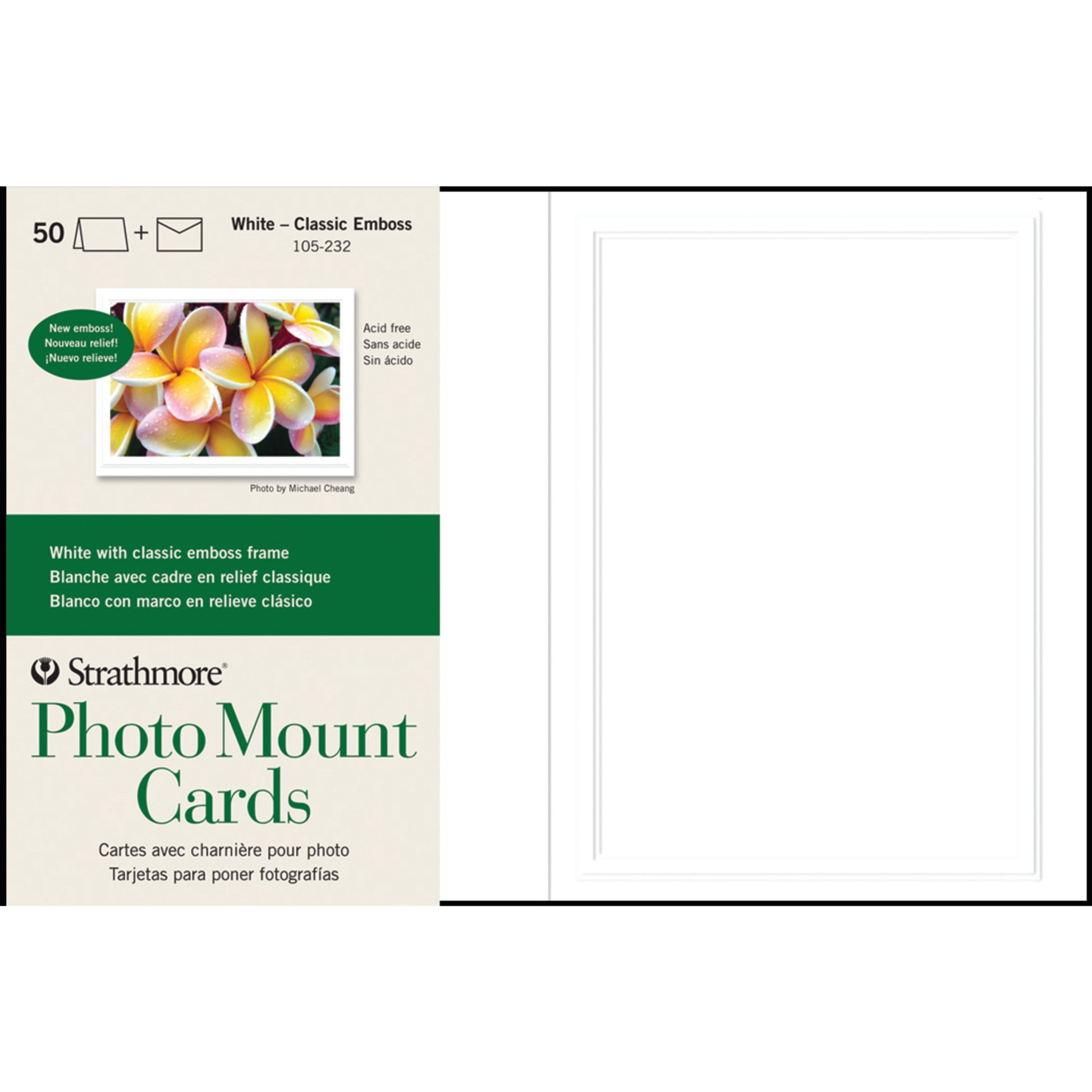 Go for a unique and personal touch with Strathmore Photomount Cards. Add your photos or artwork and showcase your creative side! These cards have a classic embossed frame and include adhesive strips to attach your images. Cards are pre-folded and come with matching envelopes. The outer dimension is 5" x 6 ⅞", while the area within the embossing will accommodate a 4" x 6" image.