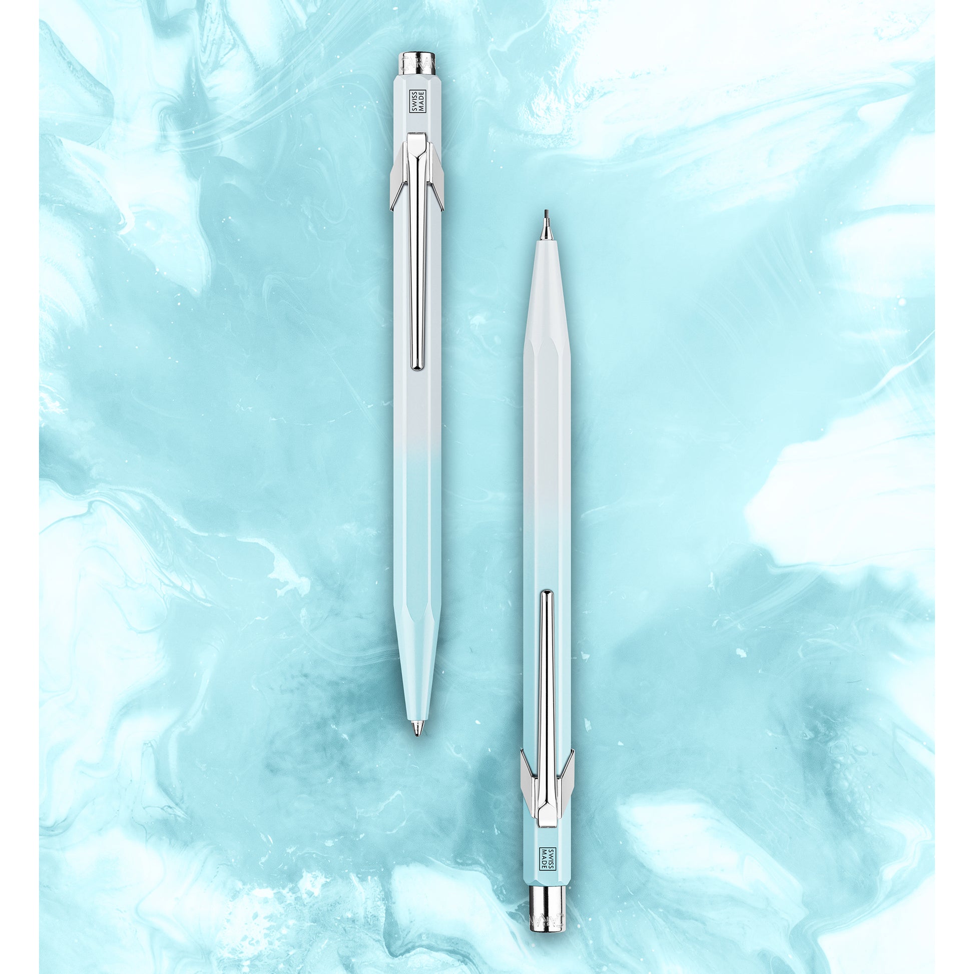 Caran d'Ache unveils Blue Lagoon, an exclusive set consisting of an 849 ballpoint pen and 844 mechanical pencil, both inspired by the pastel colours of a blue lagoon, enhanced by a subtle yet captivating colour gradation.