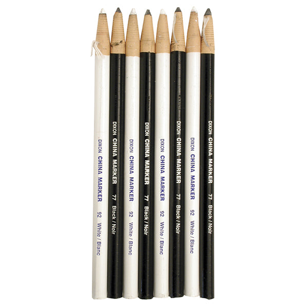 Dixon China Markers contain a very thick, smooth lead which is used to make marks on porous and non-porous surfaces such as plastic, film, paper, metal, and rubber. These pencils are also commonly referred to as grease pencils. The outer layers of the paper covering the lead peel away with the help of a tear string to expose more of the lead as the pencil is used.