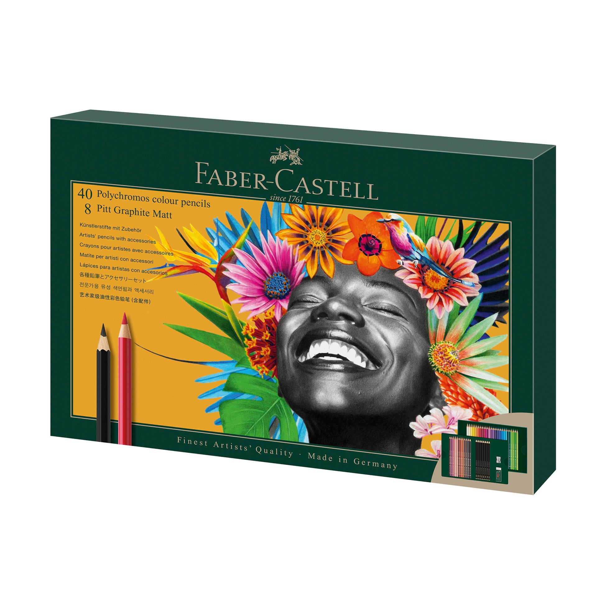 Complete artist gift set set includes 40 Faber-Castell Polychromos Colored Pencils, 8 Pitt Graphite Matte Sketching Pencils, White PVC-Free Eraser, and a single hole metal sharpener with a high-grade sharpening blade.