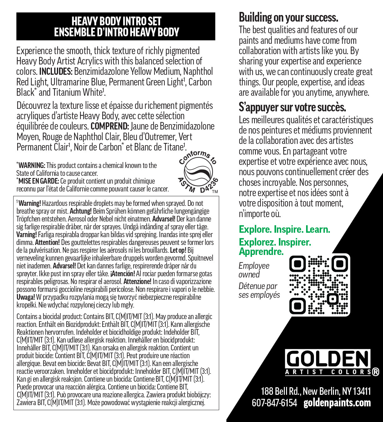 CONTENTS: Six colors in 3/4 fl. oz. / 22ml Tubes (Benzimidazolone Yellow Medium, Naphthol Red Light, Ultramarine Blue, Permanent Green Light, Carbon Black* and Titanium White). *WARNING: This product contains a chemical known to the State of California to cause cancer.