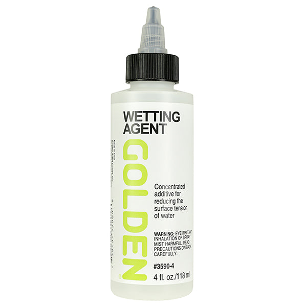 GOLDEN Wetting Agent (formerly called Acrylic Flow Release) is a surfactant. A surfactant is a concentrated surface-active liquid which reduces surface tension, thus improving wetting and increasing the flow of acrylic waterborne paints.