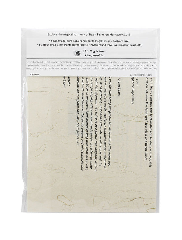 Just the kit to throw in your bag before you head out the door, or give to a friend before they leave for that long-awaited trip! Each package includes 5 handmade, pure kozo hagaki (postcard), a small Beam Paints Travel Palette with six colour (all you need to mix the rest), and a beautiful nylon #4 round travel watercolour brush.