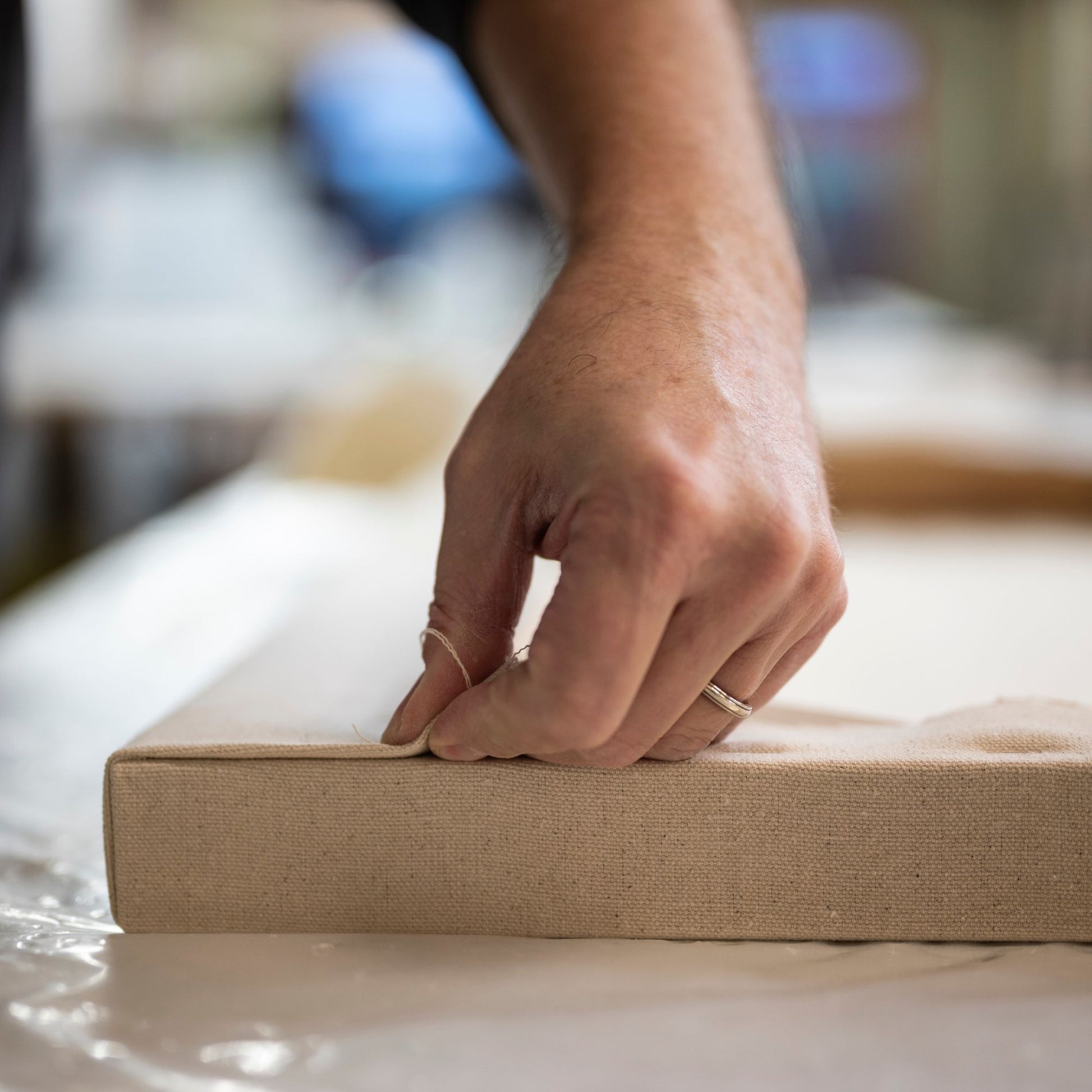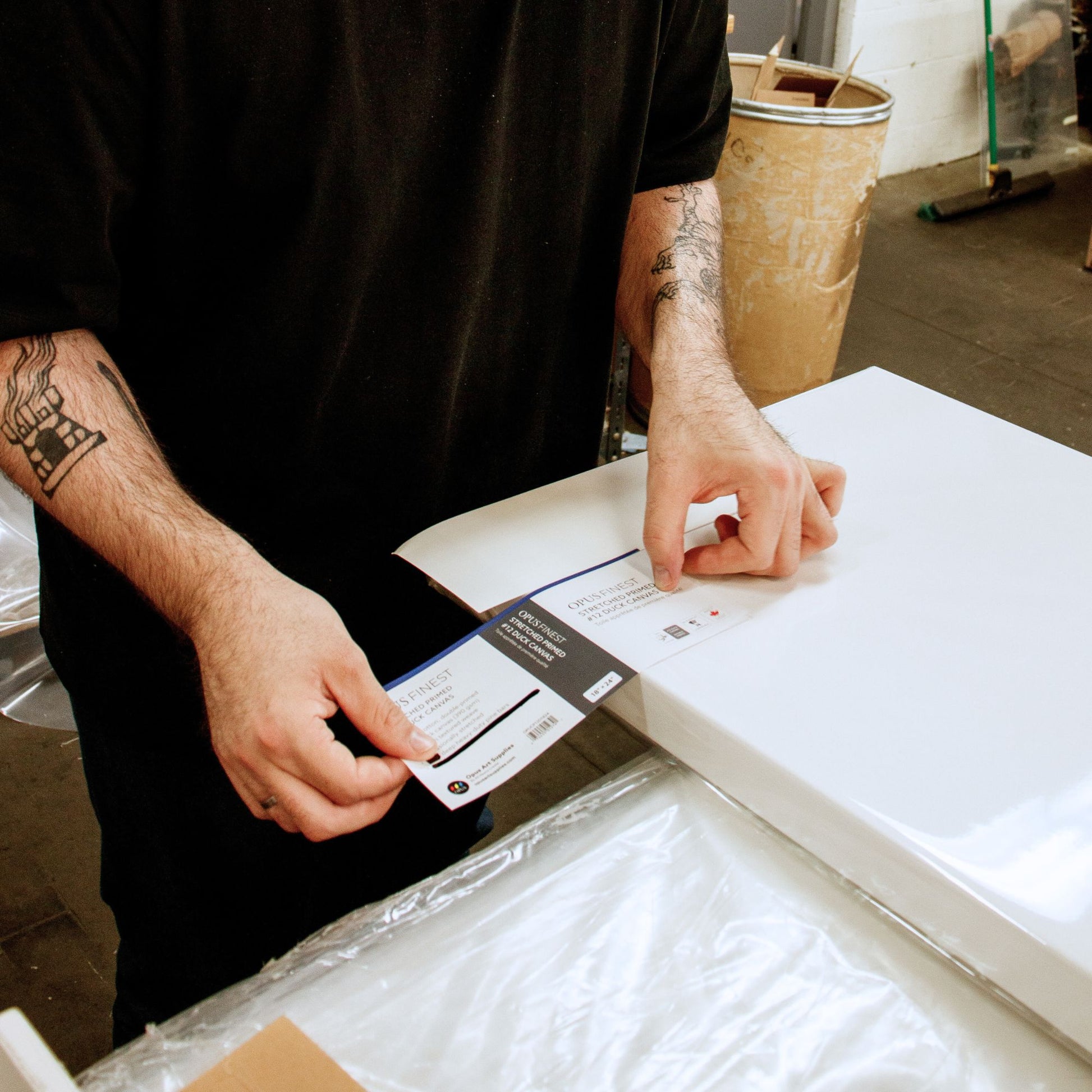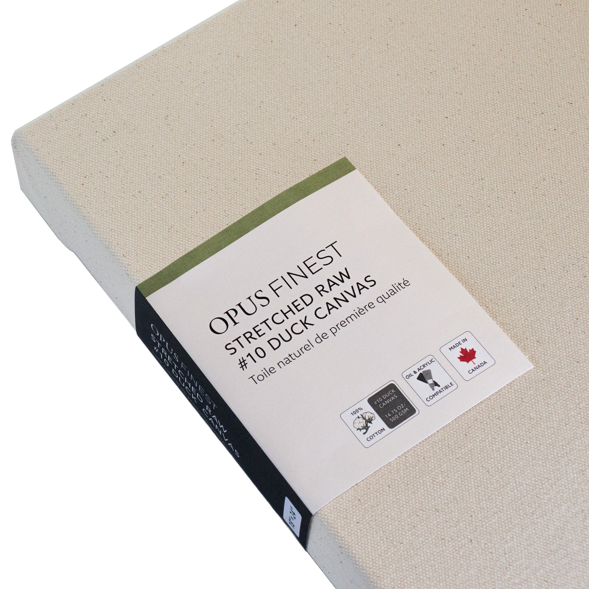 Our heaviest canvas, #10 duck (14.75 oz / 500 gsm), is stretched over the strainer for a strong and dense base. This 100% cotton canvas features an impeccably tight weave, and the thick thread used in the double-fill, plied yarn produces excellent tensile strength – all making for a seriously heavyweight, durable canvas.