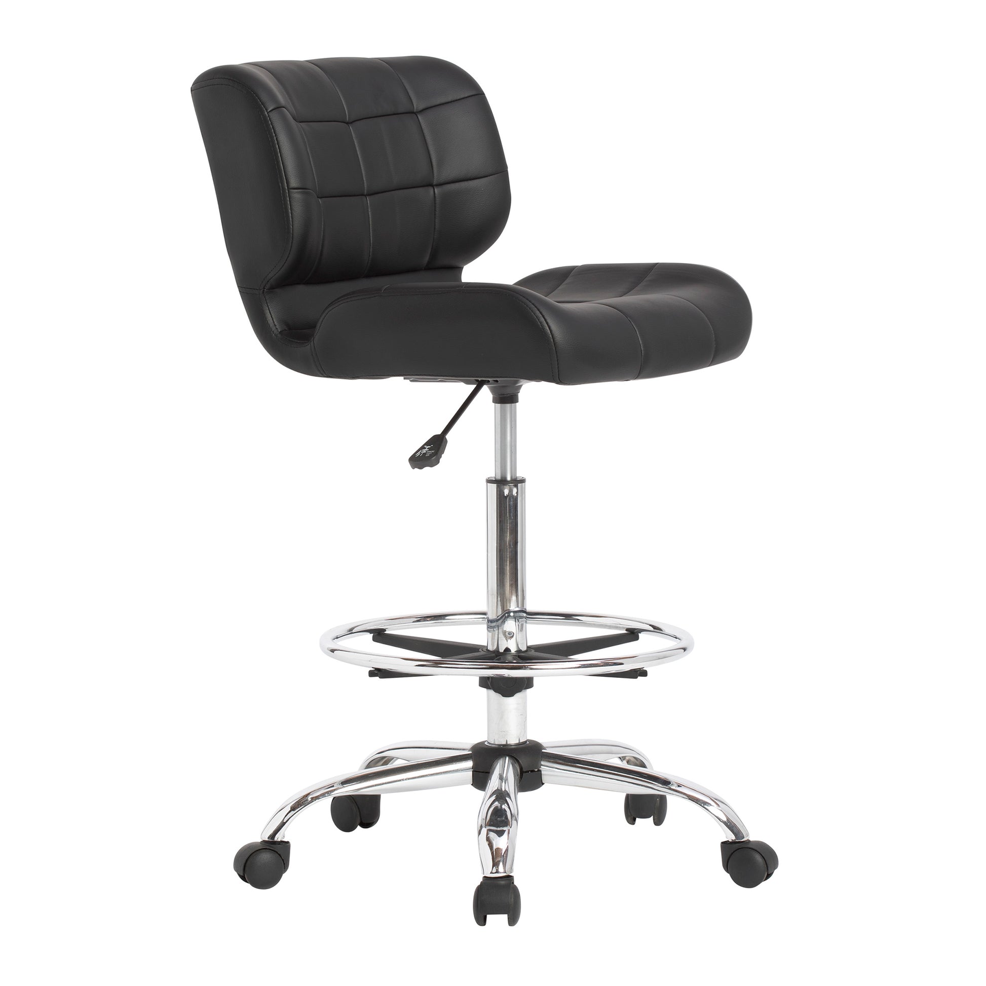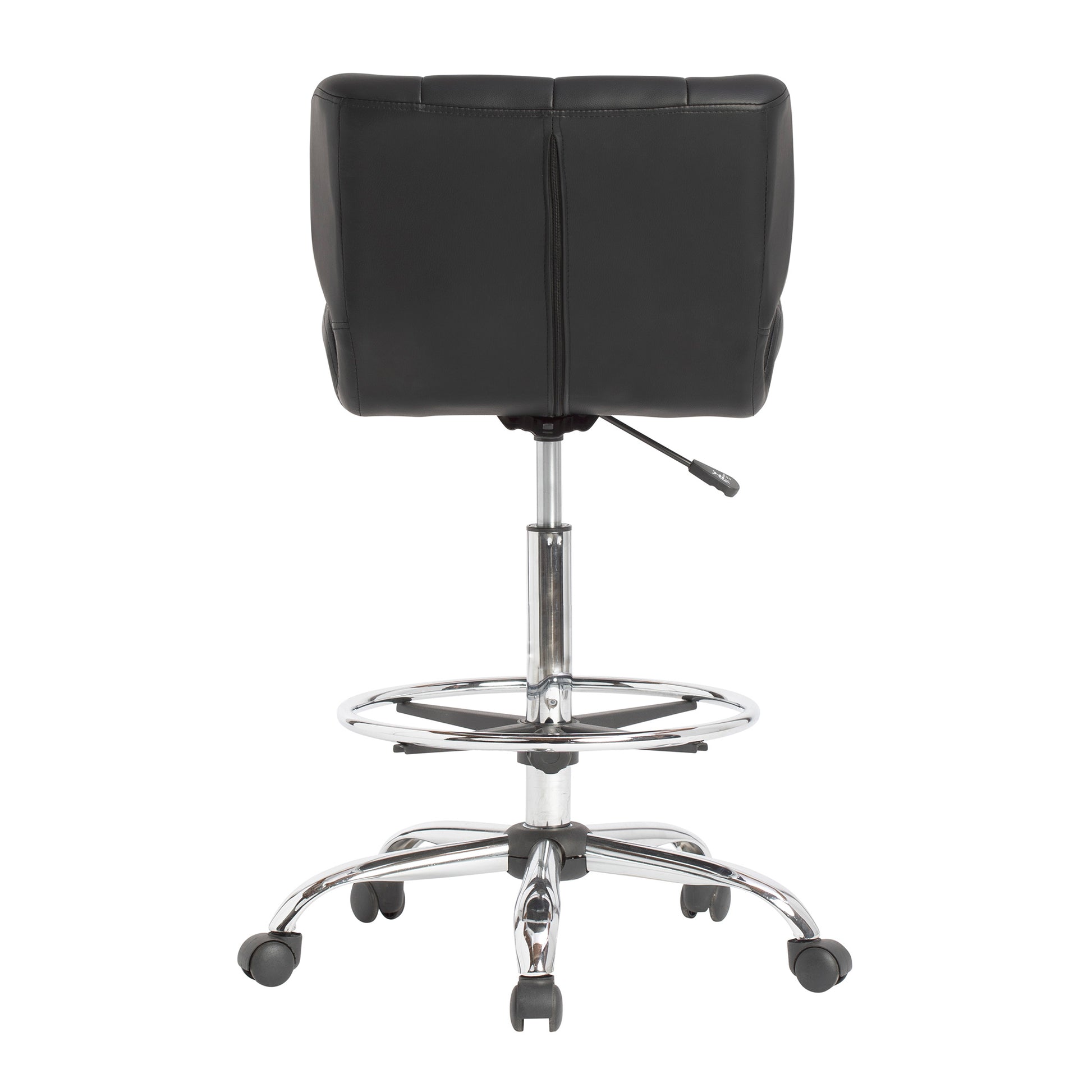 The Black Crest Drafting Chair by Studio Designs features a thick, tufted seat and back for added form-fitting support. The striking combination of tufted black vinyl with a chrome base and footrest makes this versatile drafting chair the perfect addition to any art studio or drafting workspace.